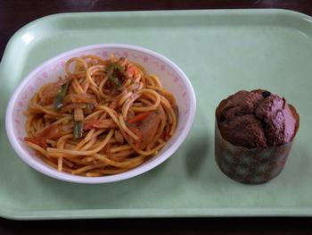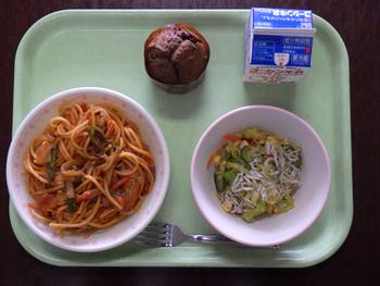 「スパゲッテイナポリタン・じゃこサラダ・チョコカップケーキ・牛乳」