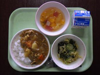 「カレーライス・海藻サラダ・ゼリー入りフルーツポンチ・牛乳」