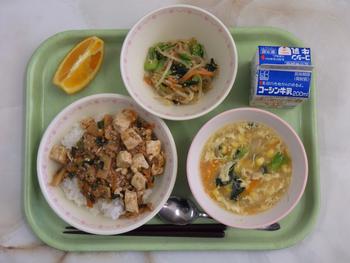 「マーボー丼・ナムル・中華コーンスープ・オレンジ・牛乳」