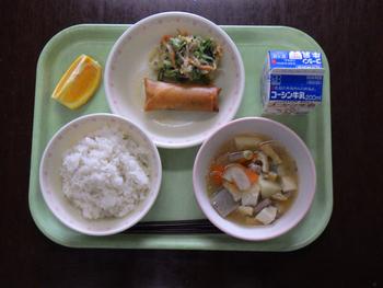 「ごはん・さけとチーズの春巻き・ごま和え・とん汁・オレンジ・牛乳」