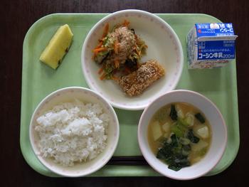 「ごはん・いかのかりんとうがらめ・キャベツのこんぶ和え・ぶたじゃがみそ汁・パインアップル・牛乳」