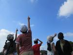 4年生は月の動きを予想し、昼間の月の観察を行っていました。西南西の方角の真上付近に月を見つけることができました。