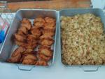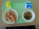 献立は、27日が・五目チャーハン、手作り揚げ餃子、春雨スープ、はちみつレモンゼリー、牛乳。