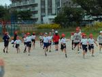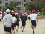 準備が終わると体育主任の鍋岡先生の合図を待ちます。自分のペースで粘り強く走ることのねらいの確認をした後スタートです。