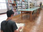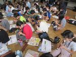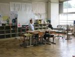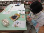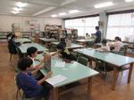 今日は1,2年生が校外学習のため、ちょっとすいてます。その空いているテーブルで図書委員さんがプレゼントするしおり作りに精を出してます。