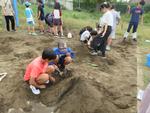 5年生が砂場にバケツで何度も水を運んでいます。こちらもちょっと「5年生は砂遊びかい?」と聞くと真剣な表情で「流れる水の働きを調べてるんです!」と山から水を流す曲がった水路づくりに余念がありません。