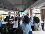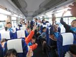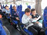 出発の会から実行委員がきちんと役割を果たします。バスレク係もみんなを楽しまそうと準備した「文字入れ替えクイズ」や「私はだれでしょう?」、「爆弾ゲーム」で大いに盛り上がりました!