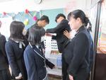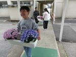 教室では、担任だった先生から胸花をつけてもらいちょっぴりうれしそうです。