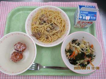 わふうボンゴレスパゲッティー わかめともやしのサラダ コロコロドーナッツ 牛乳 |