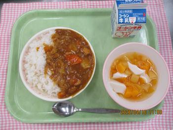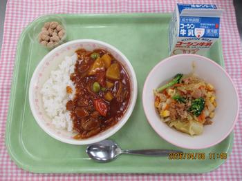 ポークカレーライス あんにんフルーツポンチ 牛乳 【1年生給食開始】 |