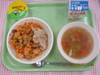 ケチャップライス ガーリックチキン アルファベットスープ はちみつレモンゼリ― 牛乳 |