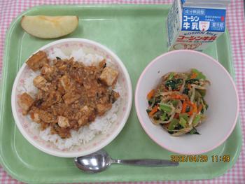 あつあげのマーボーどん こまつなのナムル りんご 牛乳 |