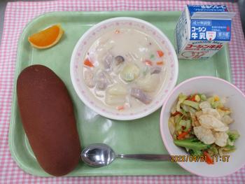 こくとうパン クリームシチュー ポテチサラダ きよみオレンジ 牛乳 |