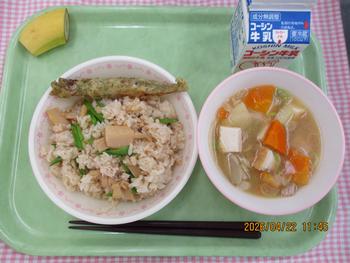 たけのこごはん ししゃものいそべあげ ぐだくさんみそしる バナナ 牛乳