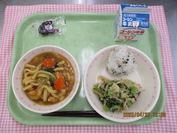 カレーうどん わかめおにぎり あおなのごまあえ ほしプルーン 牛乳 |