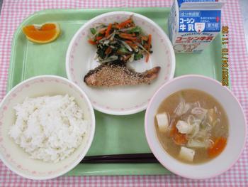ごはん さけのなんぶやき いそかあえ とんじる きよみオレンジ 牛乳 |