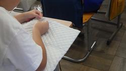6年生は家庭科でトートバックを作製しているところでした。先生の手本を見ながらまち針を刺しています。素敵なトートバックに仕上がるといいですね。