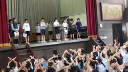 私からは、「考えて行動する」ということを伝えました。10月は1年の折り返し地点ですが、学校にある目標やきまりは作るだけでよいのかということを考えて欲しいと話しました。目標は、こんな学校にしたいとか、こんなクラスにしたいとか、こんな人になりたいといった願いがこめられているものです。きまりは、みんなが安全で幸せに過ごすために必要なものです。常三小の子供たちが「できていることは何か」、「できていないことは何か」ということを一人一人が考え、できていることは継続する、できていないことはできるようにするためにはどうするかを考え、行動する子供になってほしいと話しました。常三小は子供たちみんなの学校です。学校を作るのは子供たちです。後半戦も一緒に頑張りましょう。