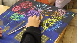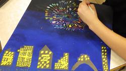 4年生は図画工作です。大きな絵画が順調に進んでいます。スクラッチの技法を使った夜空の花火がとてもきれいです。子供たちは夢中になっていました。