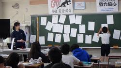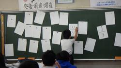 5年生の教室をのぞいてみると、黒板にたくさん白い紙が貼ってありました。学級活動などで何か決めているのかなと思ったら、算数「分数」の学習中でした。なんと分数で神経衰弱をやっていたのです。紙をめくると分数が書いてあり、同じ大きさの分数が出れば当たりだそうです。たとえば1/2と2/4が出れば同じ大きさなので当たりになります。ゲーム感覚で分数の学習をしていましたが、瞬時に同じ大きさかを考えるのはなかなか難しいですよ。