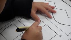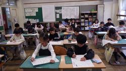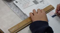3年生は算数の時間でした。1Lより少ないかさをリットルで表すにはどうすればよいかを考えています。どうやら1Lマスに線を引いて考えているようです。表し方がわかったかな。