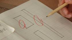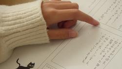 まずは算数の様子です。面積が12㎠になる長方形をノートに書く学習をしていました。できた長方形を先生に見せ、○をもらうと別の形の長方形を考えていました。先生の前は行列ができています。