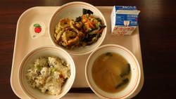 今日の給食は、6年生考案の献立part②「2月の行事給食」です。メニューは、さつまいもごはん、鬼に金棒!ちくわのゆかりあげ、わかめサラダ、キュンみそしる、りんごゼリー、牛乳です。鬼に金棒という名前だけあって、ちくわのゆかりあげはとても食べごたえがありました。おいしかったです。