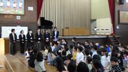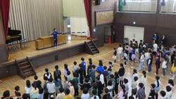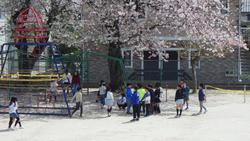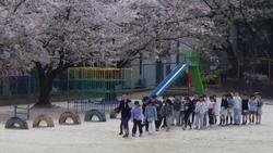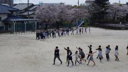 桜の花びらが舞う校庭で。学級開き。