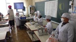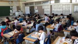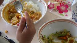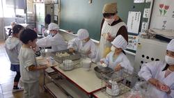 1年生にとって小学校での初めての給食です。1年生の入学をお祝いし、入学お祝い給食でした。今日の献立は、ポークカレーライス、海藻サラダ、お祝いクレープ、牛乳です。小学校では給食の配膳を子供たちが行いますので、1年生も給食当番デビュー。今日は初日ということもあり、たくさんの先生方がサポートに入り、1年生の給食の準備を行いました。白衣の着方、手の消毒の仕方、机の拭き方、給食のもらいかた、給食の配膳の仕方、牛乳パックの開け方など。今日1日でたくさんの勉強をしました。常三小のカレーライスはどうですか?と聞くと、「甘くておいしい」「ちょっぴり辛いところもあるけどおいしい」と、笑顔で答えてくれました。常三小自慢の給食を食べて、大きくなってくださいね。