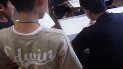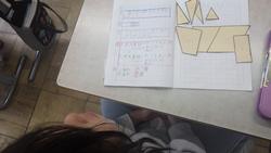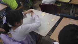 2年生算数の時間です。1年生まではさんかく、しかく、それが2年生になると、三角形と四角形という名称にかわります。それぞれの特徴をもとに、たくさんの図形を仲間分けしました。