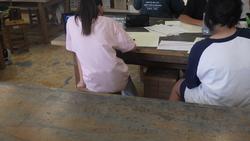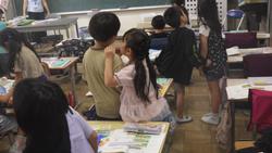 1年生算数の学習の様子です。文章を読んで式をたてます。「式が分かった子は立って、お隣さんと話しましょう。」と指示を受けると、、、最後の写真何ともほほえましくありませんか。耳打ちしているんですよ!かわいいなぁと思わずシャッターを押しました。