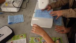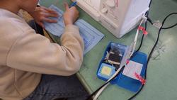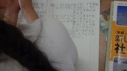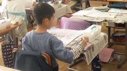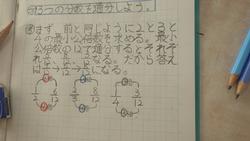 5年生、最初の2枚は家庭科裁縫実習の様子です。ミシンを使って直線縫いを行っていました。縫う前の上糸と下糸のセットが難しく、そこに苦戦している子が多かったです。3枚目の写真は、算数「分数」の学習です。とてもきれいな字でまとめているので、写真を撮らせてもらいました。