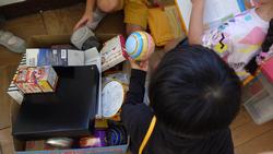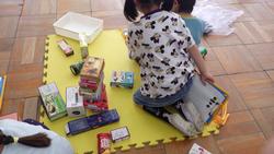 1年生算数「かたちあそび」の学習の様子です。おうちの方の協力のもと集まったいろいろな形の箱を触ったり、積み上げたりするブースを設けました。五感を働かせながらの学習に、子供たちはとても意欲的に取り組んでいました。