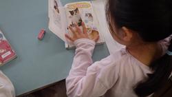 1年生、図書室での様子です。国語の学習で生き物を調べるために図書室を利用し、図鑑を読んでいました。子供に「本は好き?」と聞くと「大好き」と答えていました。すばらしいですね。