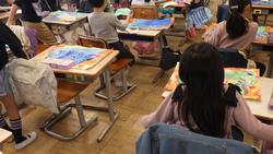 2年生図工「大きな絵」の学習です。学習も終盤に差し掛かり、大きな魚や自分を描いてそれを切り抜きし、本体の絵(作品)に貼り付けて完成です。完成作品は、土曜参観に飾られますので、どうぞお楽しみに。