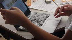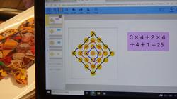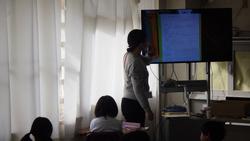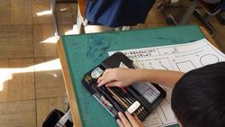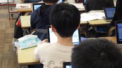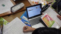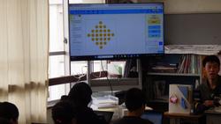 4年生は算数の時間にタブレットを使って授業を行っていました。タブレットに入っているアプリを使い、教師が子供たちのタブレットに課題(テレビのドット図)を配信し、それを受け取った子供たちはタブレットに自分の考えを打ち込んでいきます。それは、他の子供たちも参照することができるので、リアルタイムで互いの考え方を参考にすることができます。