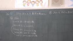 2年生算数「大きな数」の学習です。今日の問題は「3800はどんな数といえるでしょうか」です。たとえば、100を38個集めた数、1000を3個と100を8個合わせた数、4000より200小さい数・・・など、一つの数をいろいろな見方で表すことで、数感覚を豊かにします。