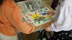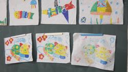 最初の3枚は算数「たしざんとひきざん」の学習の様子です。問題文の数字を、〇や△、□を使って表します。そうすると、足し算なのか引き算なのかが判断することができます。次の3枚は図工「カラー版画」の学習の様子です。カラーシールを貼った画用紙に濡らした紙を置いてこするのですが、その紙を置くのがとても難しい。そこで、2人1組になって協力しながら作業を進めていました。