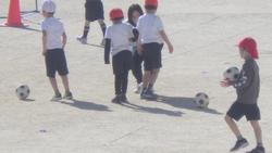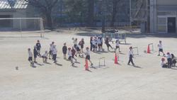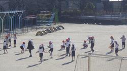 1、2年生が校庭を半分ずつ使って体育に取り組んでいました。1年生はサッカー、2年生は短縄跳びです。風が強くてボールがあっちへコロコロ、こっちへコロコロしていましたが、どの子も楽しく活動することができました。