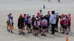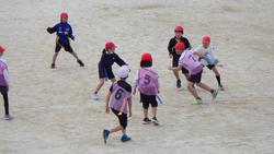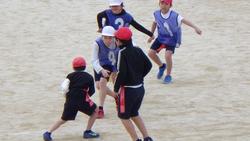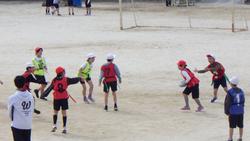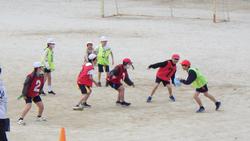 4年生は校庭でタグラグビーを学習していました。タグラグビーは、敵の腰についているタグを奪うことが、ラグビーでいうタックルのかわりになります。タグを奪われないように敵をかわすのも一苦労、楕円のボールを味方にパスするのも一苦労です。声を掛け合いながら楽しく試合をしていました。まだまだ上達していきそうです。