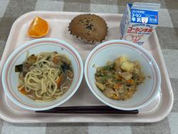 だしかおるしょうゆラーメン ツナとポテトのソテー いもいり黒糖蒸しパン 国産オレンジ 牛乳 |