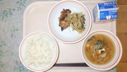 8日(月)ごはん ユーリンチー もやしのピリからあえ たまごスープ なし ぎゅうにゅう