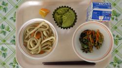 29日(月)ごもくうどん もやしのぴりからあえ てづくりまっちゃむしぱん ネーブルオレンジ ぎゅうにゅう