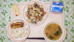 10日(月)ごはん、わかさぎフリッター、にくどうふ、みそしる、りんご、ぎゅうにゅう