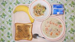 13日(木)セサミトースト、だいずのカリカリサラダ、クラムチャウダー、バナナ、ぎゅうにゅう
