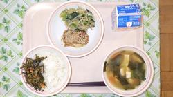 19日(水)ごはん、くきわかめのきんぴら、なまあげのにくまき、からしあえ、みそしる、ぎゅうにゅう