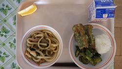 20日(木)キムチうどん、ちくわのいそべあげ、ごまきゅうり、しおむすび、ネーブルオレンジ、ぎゅうにゅう