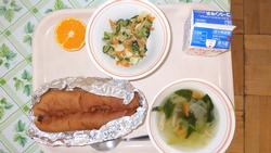 27日(木)ごはん、さんまのねぎソース、レモンあえ、かきたまじる、ぎゅうにゅう