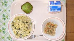28日(金)はくさいのペペロンチーノ、きりぼしだいこんサラダ、てづくりほうれんそうマフィン、ぎゅうにゅう