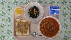 1月14日 【物語給食】ツナコーントースト わかめサラダ まめとウインナーのトマトスープ てづくりオレンジゼリー ぎゅうにゅう